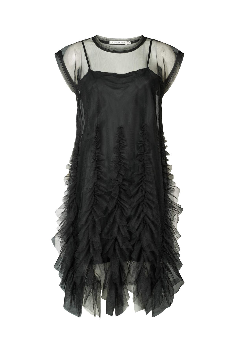 Tillverkad i ett lätt, transparent tyg är tyllklänningen perfekt för lager-på-lager-styling. Den avslappnade siluetten definieras av korta ärmar, rund halsringning och en mängd volanger som tillför en lekfull och fräsch känsla till plagget.
